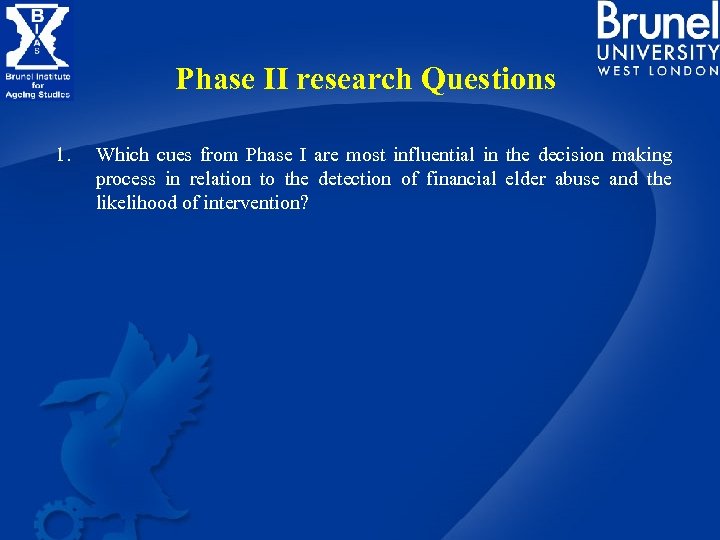 Phase II research Questions 1. Which cues from Phase I are most influential in the decision making process in relation to the detection of financial elder abuse and the likelihood of intervention?