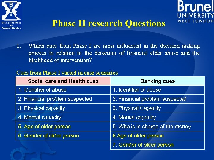 Phase II research Questions 1. Which cues from Phase I are most influential in the decision making process in relation to the detection of financial elder abuse and the likelihood of intervention? Cues from Phase I varied in case scenarios Social care and Health cues Banking cues 1. Identifier of abuse 2. Financial problem suspected 3. Physical capacity 3. Physical Capacity 4. Mental capacity 5. Age of older person 5. Who is in charge of the money 6. Gender of older person 6. Age of older person 7. Gender of older person