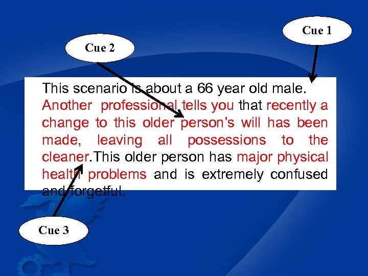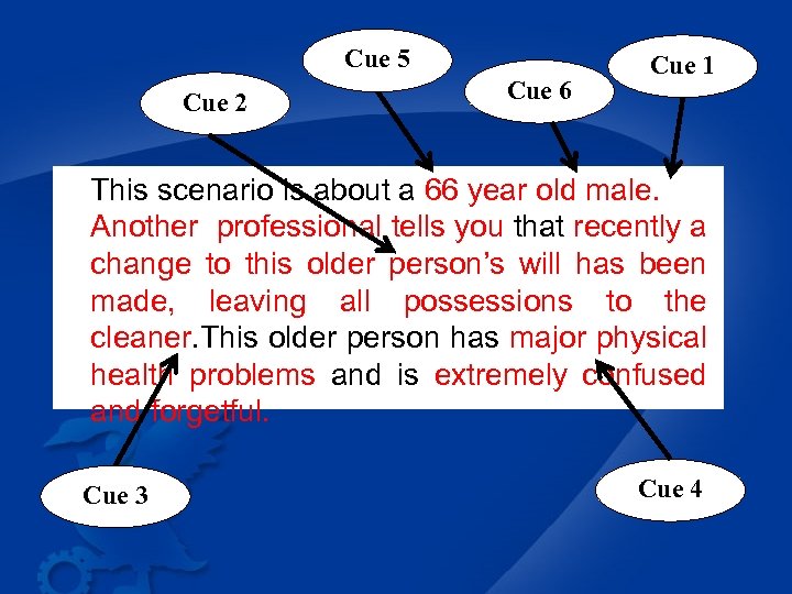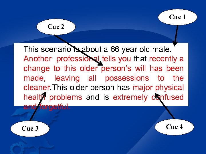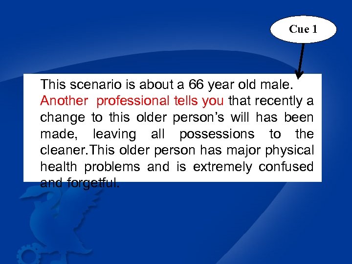 Cue 5 Cue 2 Cue 6 Cue 1 This scenario is about a 66 year old male. Another professional tells you that recently a change to this older person’s will has been made, leaving all possessions to the cleaner. This older person has major physical health problems and is extremely confused and forgetful. Cue 3 Cue 4