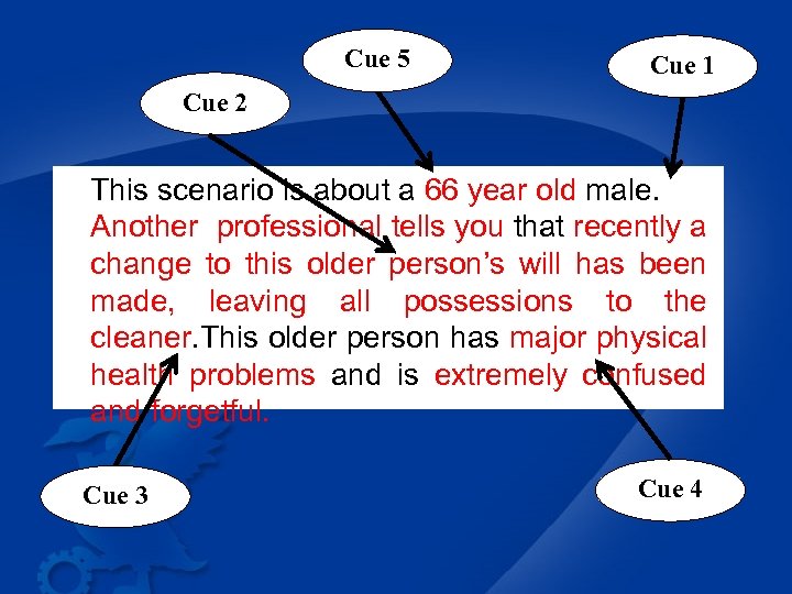 Cue 5 Cue 1 Cue 2 This scenario is about a 66 year old male. Another professional tells you that recently a change to this older person’s will has been made, leaving all possessions to the cleaner. This older person has major physical health problems and is extremely confused and forgetful. Cue 3 Cue 4