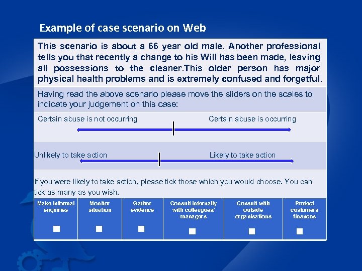 Example of case scenario on Web This scenario is about a 66 year old male. Another professional tells you that recently a change to his Will has been made, leaving all possessions to the cleaner. This older person has major physical health problems and is extremely confused and forgetful. Having read the above scenario please move the sliders on the scales to indicate your judgement on this case: Certain abuse is not occurring Unlikely to take action Certain abuse is occurring Likely to take action If you were likely to take action, please tick those which you would choose. You can tick as many as you wish. Make informal enquiries Monitor situation Gather evidence Consult internally with colleagues/ managers Consult with outside organisations Protect customers finances