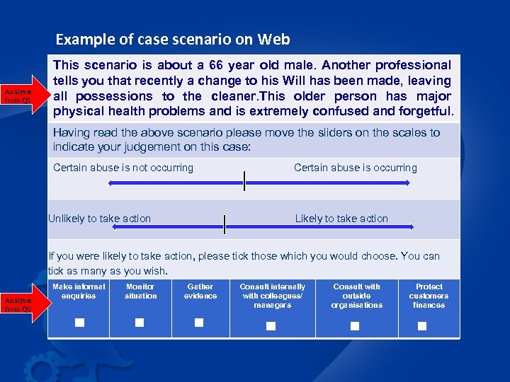 Example of case scenario on Web Analyses from Q 1 This scenario is about a 66 year old male. Another professional tells you that recently a change to his Will has been made, leaving all possessions to the cleaner. This older person has major physical health problems and is extremely confused and forgetful. Having read the above scenario please move the sliders on the scales to indicate your judgement on this case: Certain abuse is not occurring Unlikely to take action Certain abuse is occurring Likely to take action If you were likely to take action, please tick those which you would choose. You can tick as many as you wish. Analyses from Q 2 Make informal enquiries Monitor situation Gather evidence Consult internally with colleagues/ managers Consult with outside organisations Protect customers finances