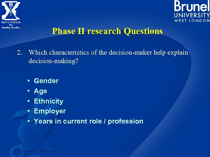 Phase II research Questions 2. Which characteristics of the decision-maker help explain decision-making? • • • Gender Age Ethnicity Employer Years in current role / profession