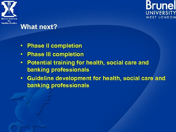 What next? • Phase II completion • Phase III completion • Potential training for health, social care and banking professionals • Guideline development for health, social care and banking professionals