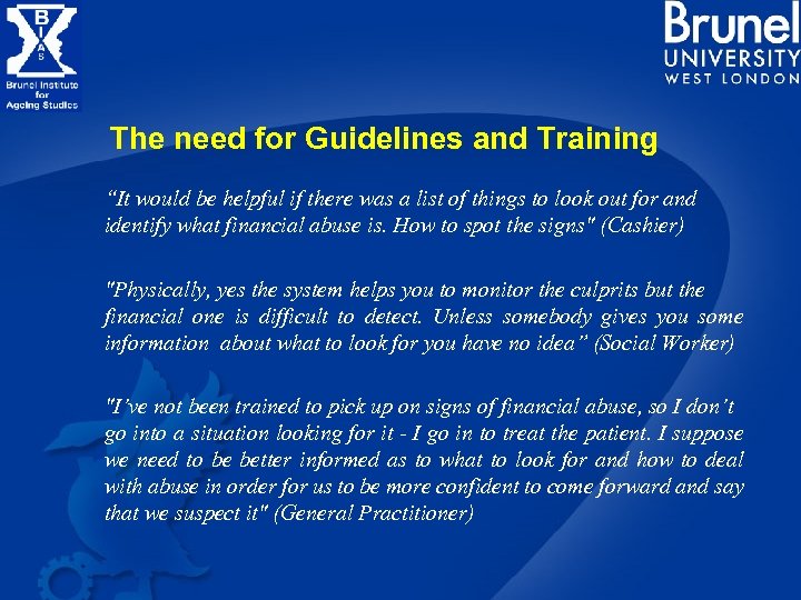 The need for Guidelines and Training “It would be helpful if there was a list of things to look out for and identify what financial abuse is. How to spot the signs" (Cashier) "Physically, yes the system helps you to monitor the culprits but the financial one is difficult to detect. Unless somebody gives you some information about what to look for you have no idea” (Social Worker) "I’ve not been trained to pick up on signs of financial abuse, so I don’t go into a situation looking for it - I go in to treat the patient. I suppose we need to be better informed as to what to look for and how to deal with abuse in order for us to be more confident to come forward and say that we suspect it" (General Practitioner)