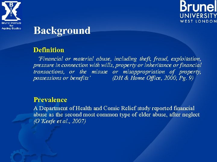 Background Definition ‘Financial or material abuse, including theft, fraud, exploitation, pressure in connection with wills, property or inheritance or financial transactions, or the misuse or misappropriation of property, possessions or benefits’ (DH & Home Office, 2000, Pg. 9) Prevalence A Department of Health and Comic Relief study reported financial abuse as the second most common type of elder abuse, after neglect (O’Keefe et al. , 2007)