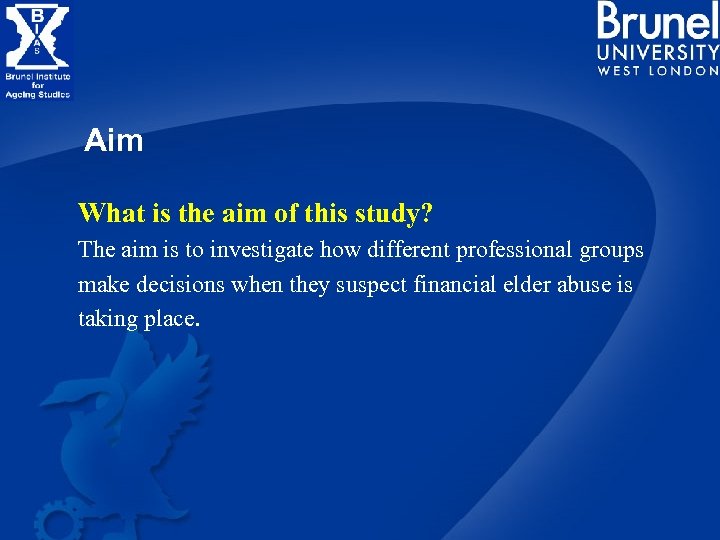Aim What is the aim of this study? The aim is to investigate how different professional groups make decisions when they suspect financial elder abuse is taking place.