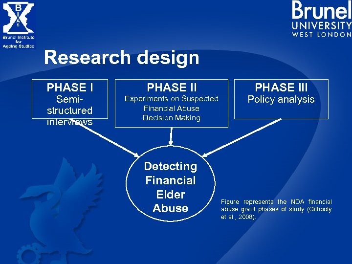 Research design PHASE I Semistructured interviews PHASE II Experiments on Suspected Financial Abuse Decision Making Detecting Financial Elder Abuse PHASE III Policy analysis Figure represents the NDA financial abuse grant phases of study (Gilhooly et al. , 2008).