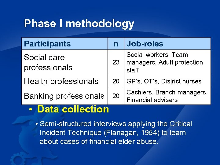 Phase I methodology Participants n Job-roles Social care professionals 23 Social workers, Team managers, Adult protection staff Health professionals 20 GP’s, OT’s, District nurses Banking professionals 20 Cashiers, Branch managers, Financial advisers • Data collection • Semi-structured interviews applying the Critical Incident Technique (Flanagan, 1954) to learn about cases of financial elder abuse.