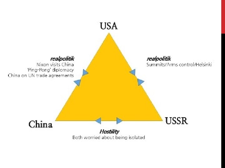 REASONS FOR DÉTENTE • • USA needed to end Vietnam Realpolitik • • • Focused on practical factors, not just ideology Focus on American economy China worried about international isolation • Wanted to get back at Soviets