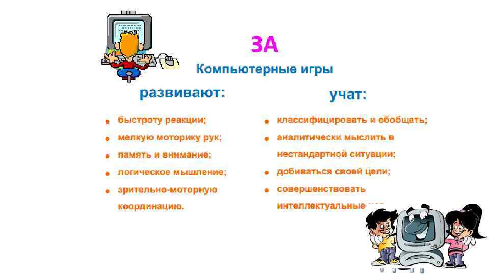 Несколько советов для мам и пап: • Подчеркивайте словом и действием, что эта «умная машина» – рабочий инструмент. • Покажите, что вы используете компьютер только для дела. Например, строите с его помощью графики или пишите статьи. Для ребенка важно именно ваше поведение, а не то, что вы говорите. • Не используйте агрессивные игры, чтобы расслабиться после работы или, хотя бы, не играйте в них при ребенке. • Не делайте из компьютера тайны за семью печатями, а, наоборот, обеспечьте свободный доступ к обучающим и развивающим программам.