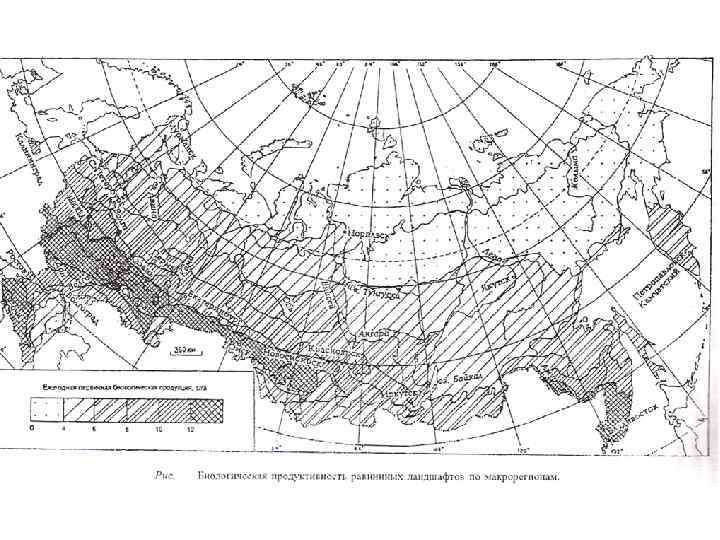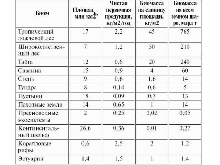 • • – очень высокая (свыше 2 кг/м 2 в год). – высокая (1– 2 кг/м 2 в год). – умеренная (0, 25– 1 кг/м 2 в год). – низкая (менее 0, 25 кг/м 2 в год). сосновые и березовые леса коралловых рифы, высокие и густых зарослей тростника в дельтах Волги Пустыни липово‑дубовые леса, джунгли тундра прибрежные заросли рогоза или тростника на озере, сельскохозяйственные посевы, арктические пустыни островов