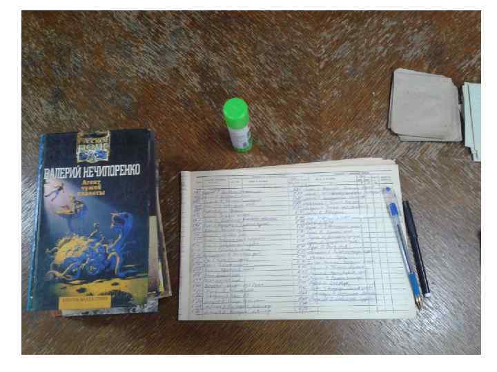 6 день Запись книг в тетрадь учёта которые без инвентарного номера, запись формуляра, клейка кармашков, расстановка на полках