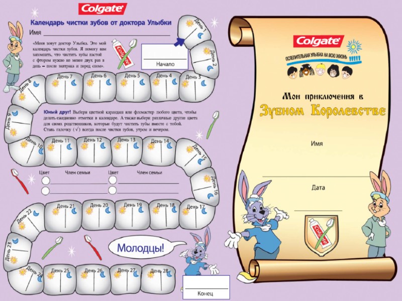 Дидактические материалы 2) Детям для использования дома Брошюра «Родители, внимание!» «Календарь чистки зубов от доктора Улыбки» Зубная паста и зубная щетка Colgate Наклейка «4 секрета экономии воды»