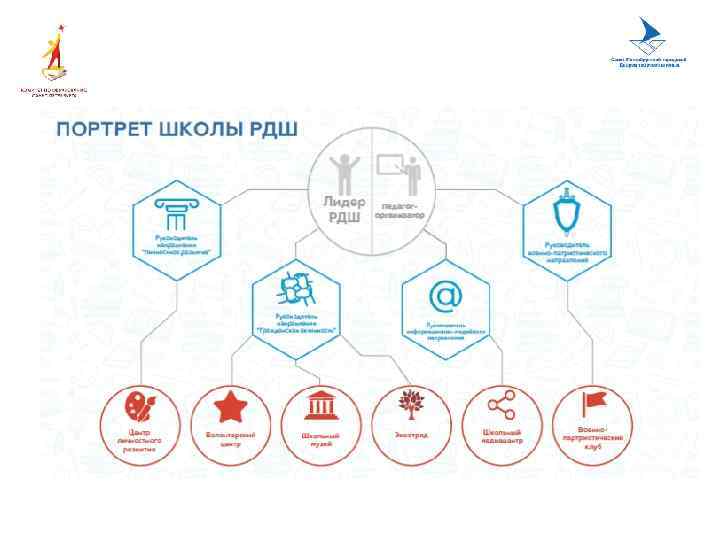 Всероссийская общественно-государственная детскоюношеская организация общественная организация «Российское движение школьников» Большая детская редакция, создание школьных газет, радио и телевидения, работа с социальными сетями, подготовка информационного контента, дискуссионные площадки Добровольчество, поисковая деятельность, изучение истории России, краеведение, создание и развитие школьных музеев Юнармейцы, Зарничники, юные спасатели, юные казаки, юные пограничники, юный спецназ Росгвардии, юные друзья полиции, юные инспектора движения Творческое развитие, популяризация здорового образа жизни и спорта, выбор будущей профессии