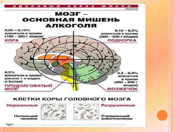 ДЕЙСТВИЕ АЛКОГОЛЯ НА ОРГАНИЗМ Алкоголь действует подобно наркотическим веществам и типичным ядам – вначале возбуждающе, затем парализующее. Раньше всего парализуются высшие центры. При частом употреблении алкогольных напитков сначала наблюдаются нарушения деятельности различных органов, а затем появляются анатомические изменения в них.