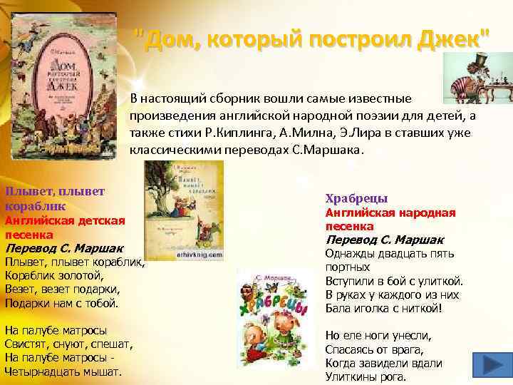 "Дом, который построил Джек" В настоящий сборник вошли самые известные произведения английской народной поэзии для детей, а также стихи Р. Киплинга, А. Милна, Э. Лира в ставших уже классическими переводах С. Маршака. Плывет, плывет кораблик Английская детская песенка Перевод С. Маршак Храбрецы Английская народная песенка Перевод С. Маршак Плывет, плывет кораблик, Кораблик золотой, Везет, везет подарки, Подарки нам с тобой. Однажды двадцать пять портных Вступили в бой с улиткой. В руках у каждого из них Бала иголка с ниткой! На палубе матросы Свистят, снуют, спешат, На палубе матросы Четырнадцать мышат. Но еле ноги унесли, Спасаясь от врага, Когда завидели вдали Улиткины рога.