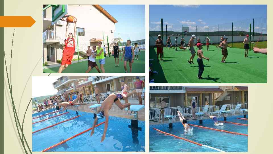Оздоровление тренировки Территория имеет многофункциональные спортивные площадки для игр в волейбол, баскетбол, мини-футбол; футбольное поле; площадки для пляжного волейбола и конечно же бассейн 2 тренировочных программы Для спортсменов - включает в себя каждый день тренировки в бассейне (совершенствование техники плавания по последним методикам, улучшение результатов) и ОФП (развитие выносливости, силы, гибкости и координации) Для детей, занимающихся для здоровья и общего развития - включает в себя 3 раза в неделю тренировки в бассейне (изучение новых способов плавания, совершенствование навыков плавания) а так же 2 раза в неделю ОФП равномерное развитие всех без исключение групп мышц и физических качеств). Таким образом по одной тренировке каждый день. После отдыха в лагере дети получать уверенные навыки плавания всеми способами, которые останутся на всю жизнь