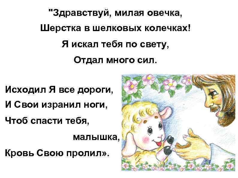 "Здравствуй, милая овечка, Шерстка в шелковых колечках! Я искал тебя по свету, Отдал много сил. Исходил Я все дороги, И Свои изранил ноги, Чтоб спасти тебя, малышка, Кровь Свою пролил» .