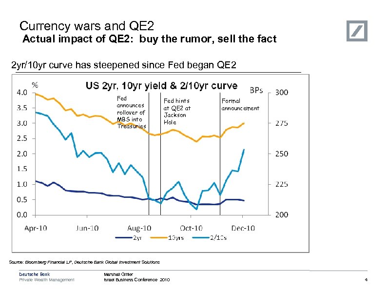 Currency wars and QE 2 The theoretical impact of QE — Bond Hyperinflation yields fall; yield curve flattens Deflation — Risk premium declines — Yield spreads with corporate bonds compress — Stocks rise; wealth effect boosts spending — Currency declines, exports pick up, economy recovers Deutsche Bank Private Wealth Management Marshall Gittler Israel Business Conference 2010 3