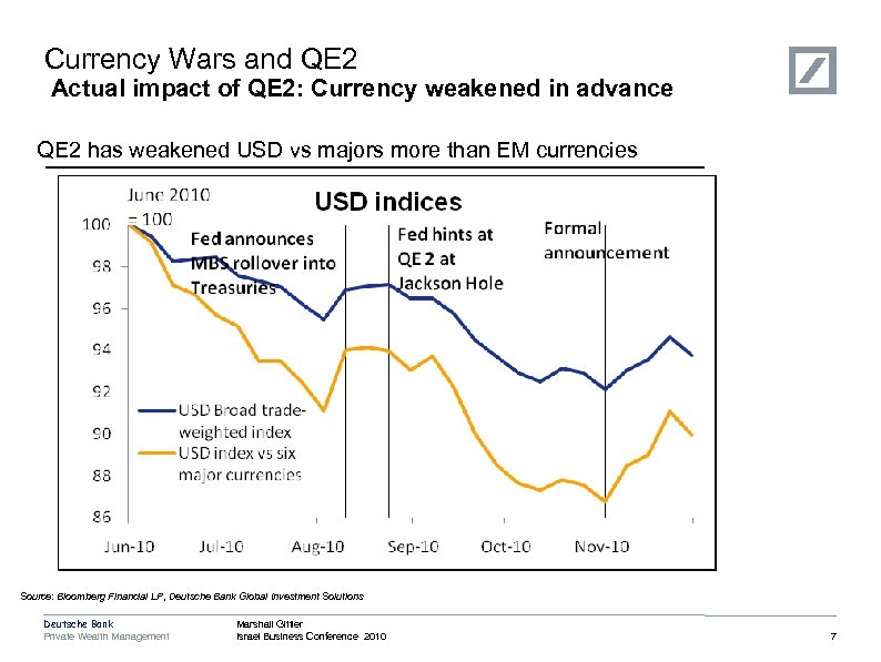 Currency Wars and QE 2 Actual impact of QE 2: supporting equities US stocks responded to Fed’s QE 1. 0 & expectations of 2. 0 Hyperinflation Source: Bloomberg Financial LP, Deutsche Bank Global Investment Solutions Deutsche Bank Private Wealth Management Marshall Gittler Israel Business Conference 2010 6