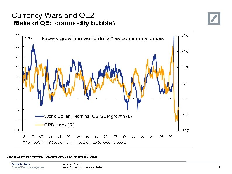 Currency Wars and QE 2 Risks of QE: USD collapse? Hyperinflation Deflation Source: Bloomberg Financial LP, Deutsche Bank Global Investment Solutions Deutsche Bank Private Wealth Management Marshall Gittler Israel Business Conference 2010 8