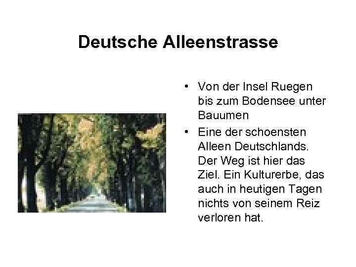 Deutsche Alleenstrasse • Von der Insel Ruegen bis zum Bodensee unter Bauumen • Eine der schoensten Alleen Deutschlands. Der Weg ist hier das Ziel. Ein Kulturerbe, das auch in heutigen Tagen nichts von seinem Reiz verloren hat.