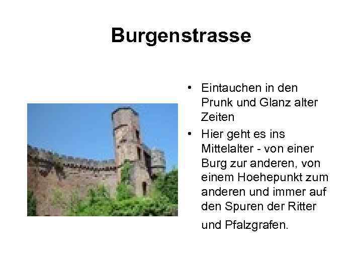 Burgenstrasse • Eintauchen in den Prunk und Glanz alter Zeiten • Hier geht es ins Mittelalter - von einer Burg zur anderen, von einem Hoehepunkt zum anderen und immer auf den Spuren der Ritter und Pfalzgrafen.