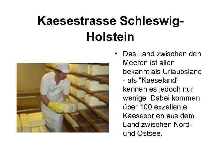 Kaesestrasse Schleswig. Holstein • Das Land zwischen den Meeren ist allen bekannt als Urlaubsland - als "Kaeseland" kennen es jedoch nur wenige. Dabei kommen über 100 exzellente Kaesesorten aus dem Land zwischen Nordund Ostsee.
