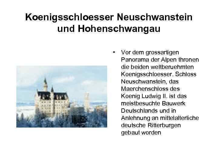 Koenigsschloesser Neuschwanstein und Hohenschwangau • Vor dem grossartigen Panorama der Alpen thronen die beiden weltberuehmten Koenigsschloesser. Schloss Neuschwanstein, das Maerchenschloss des Koenig Ludwig II. ist das meistbesuchte Bauwerk Deutschlands und in Anlehnung an mittelalterliche deutsche Ritterburgen gebaut worden