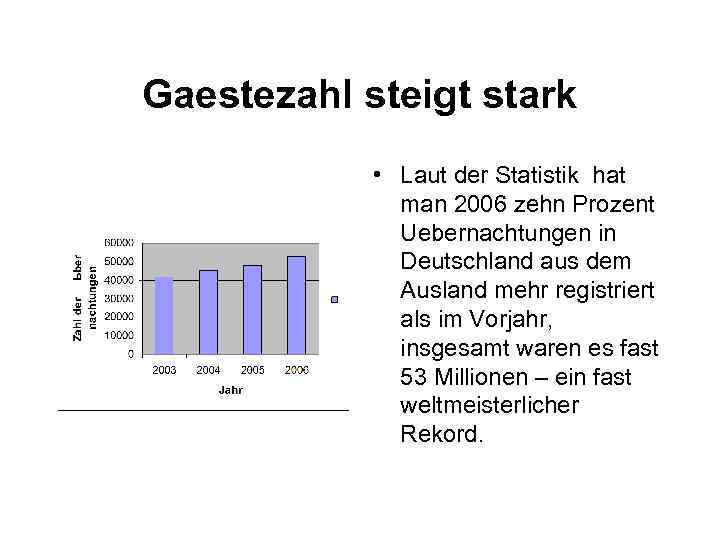 Gaestezahl steigt stark • Laut der Statistik hat man 2006 zehn Prozent Uebernachtungen in Deutschland aus dem Ausland mehr registriert als im Vorjahr, insgesamt waren es fast 53 Millionen – ein fast weltmeisterlicher Rekord.