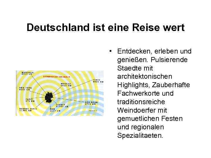 Deutschland ist eine Reise wert • Entdecken, erleben und genießen. Pulsierende Staedte mit architektonischen Highlights, Zauberhafte Fachwerkorte und traditionsreiche Weindoerfer mit gemuetlichen Festen und regionalen Spezialitaeten.