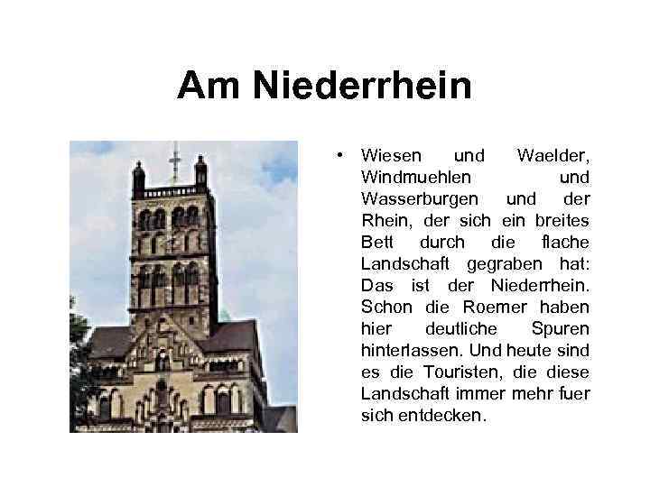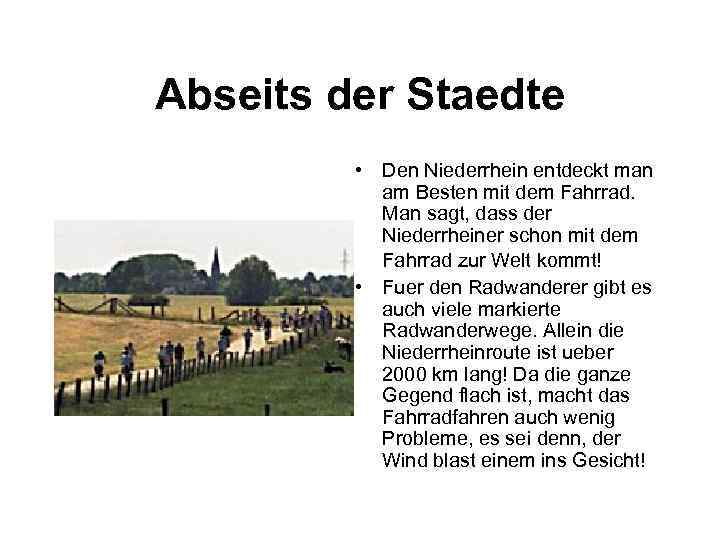 Abseits der Staedtе • Den Niederrhein entdeckt man am Besten mit dem Fahrrad. Man sagt, dass der Niederrheiner schon mit dem Fahrrad zur Welt kommt! • Fuer den Radwanderer gibt es auch viele markierte Radwanderwege. Allein die Niederrheinroute ist ueber 2000 km lang! Da die ganze Gegend flach ist, macht das Fahrradfahren auch wenig Probleme, es sei denn, der Wind blast einem ins Gesicht!
