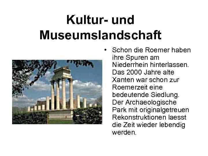 Kultur- und Museumslandschaft • Schon die Roemer haben ihre Spuren am Niederrhein hinterlassen. Das 2000 Jahre alte Xanten war schon zur Roemerzeit eine bedeutende Siedlung. Der Archaeologische Park mit originalgetreuen Rekonstruktionen laesst die Zeit wieder lebendig werden.