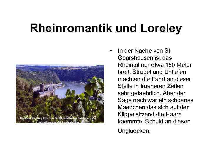 Rheinromantik und Loreley • In der Naehe von St. Goarshausen ist das Rheintal nur etwa 150 Meter breit. Strudel und Untiefen machten die Fahrt an dieser Stelle in frueheren Zeiten sehr gefaehrlich. Aber der Sage nach war ein schoenes Maedchen das sich auf der Klippe sitzend die Haare kaemmte, Schuld an diesen Ungluecken.