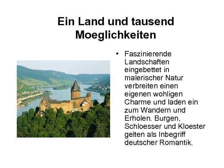 Ein Land und tausend Moeglichkeiten • Faszinierende Landschaften eingebettet in malerischer Natur verbreiten einen eigenen wohligen Charme und laden ein zum Wandern und Erholen. Burgen, Schloesser und Kloester gelten als Inbegriff deutscher Romantik.