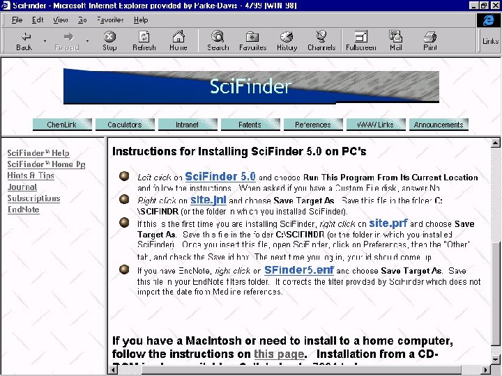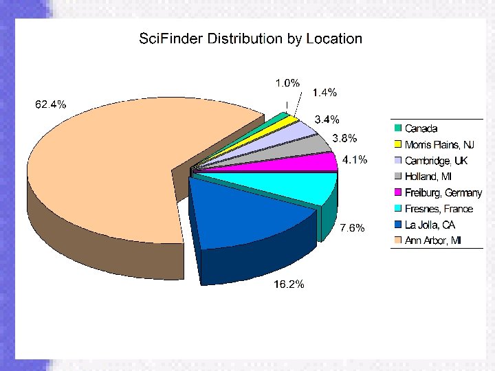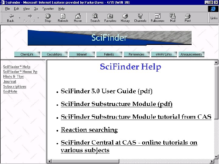 Expansion of Sci. Finder within Parke-Davis/Warner Lambert 1995 -1997 Limited to Scientists in Ann Arbor (Substructure Module testing) 1998 Expanded to Holland, MI and IRJ, France 1999 Freiburg, Germany; Cambridge, UK; Morris Plains, NJ; and Edmonton, Canada 2000 La. Jolla, CA