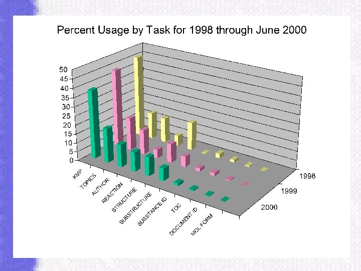 In the Beginning ARTEMIS TESTING 1993 Prototype Discussions with CAS • Initial concerns: Only PC (mostly MAC users at the time) • Internet reliable and secure? 1993 -1994 Alpha testing by the Chemists and Chemical Searchers 1994 -1995 Beta testing - enthusiasm builds May 1995 Parke-Davis first Sci. Finder subscriber