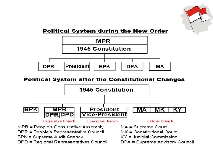 • The People Consultative Assembly (MPR) insisted to keep the original name of the constitution as 1945 Constitution though it had been amended for four times (1999 -20002001 -2002)