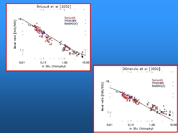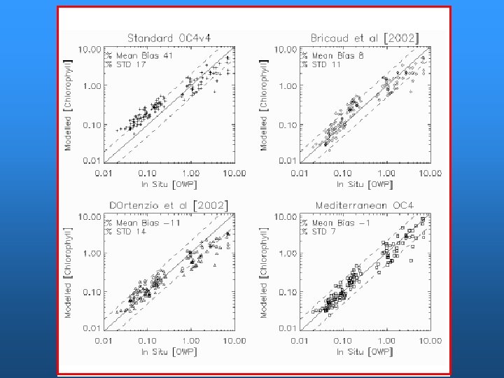 REGIONAL Validation of Ocean Color Algorithms OC 4 v 4: R is log 10 of either the D’Ortenzio et al. 2002 (DORMA): R is log 10 of the 490/555 band reflectance ratios. 443/555 or the 490/555 or the 510/555 band reflectance ratios, depending on its value (the maximum is chosen) Bricaud et al. 2002: R is log 10 of the 443/555 band reflectance ratios for Chl<0. 2 (OC 4 v 4 is used in the other cases) GLOBAL