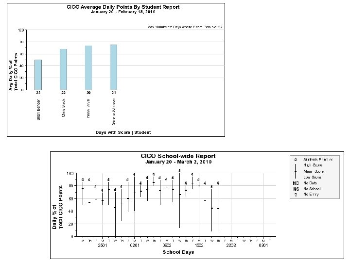 Tracking Student Progress on Check In/Check Out Number = % of total daily points Date Jason Leanne Juan Kiran Alexa 1/16/06 85 95 100 80 65 1/17/06 100 100 75 77 1/18/06 77 0 100 85 63 1/19/06 45 75 95 92 85 1/20/06 88 89 77 89 90 1/23/06 79 0 100 95 95 1/24/06 95 67 85 100 78