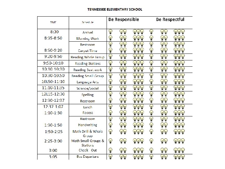 Daily class cycle • Planner checked each day • Daily entry task assignment each day • At least two homework completion sessions per week • Daily agenda posted each day