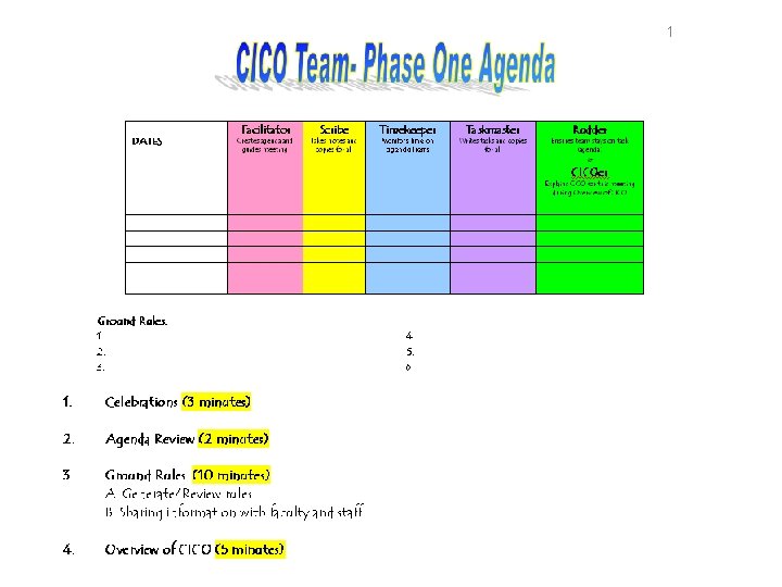With your team, determine who needs to do what tasks and by when related to: 1. Sharing information and soliciting feedback from faculty and staff, and 2. Implementing the CICO at your school based on the CICO Blueprint questions. Agenda