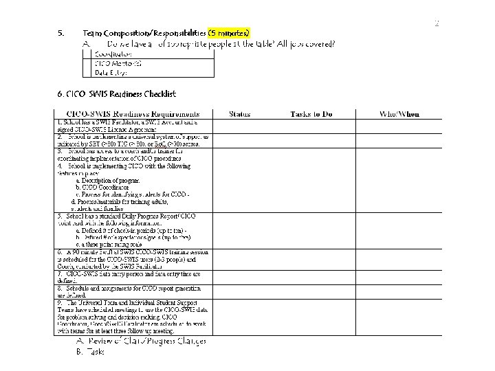 CICO-SWIS Readiness 8. Schedule and assignments for CICO report generation are defined 9. The Tier 1/Primary Preventions Team, Tier 2/Secondary Interventions Support Team, and CICO Team have scheduled meetings to use the CICO-SWIS data for problem solving and decision making. CICO Coordinator, Coach/SWIS Facilitator are scheduled to work with teams for at least three follow up meetings