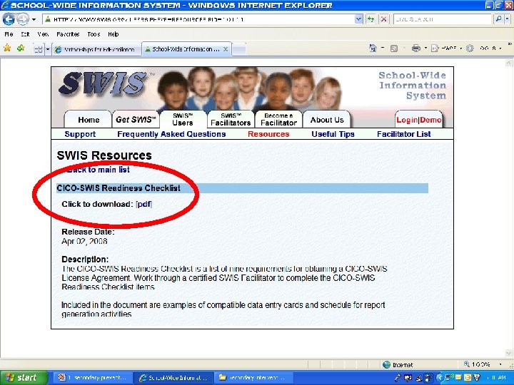 CICO-SWIS Readiness 6. A 90 minute Swift at SWIS CICO-SWIS training session is scheduled for the CICO-SWIS users (2 -3 people) and Coach, conducted by the SWIS Facilitator 7. CICO-SWIS data entry person and data entry time are defined