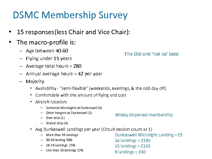 DSMC Membership Survey • 15 responses(less Chair and Vice Chair): • The macro-profile is: – – – Age between 40 -60 Flying under 15 years Average total hours = 280 Annual average hours = 42 per year Majority The Old and ‘not so’ bold • Availability - “semi-flexible” (weekends, evenings, & the odd day off) • Comfortable with the amount of flying and cost • Aircraft location: – – Somerset Microlights at Dunkeswell (6) Other hangers at Dunkeswell (2) Own strip (1) Shared strip (4) Widely dispersed membership • Avg Dunkeswell Landings per year (Circuit session count as 1) – More than 36 landings Dunkeswell Microlight Landing = £ 5 – 30 -36 landing 50% 36 landings = £ 180 – 18 -24 Landings 25% 20 landings = £ 100 – Less than 18 landings 12% 8 landings = £ 40