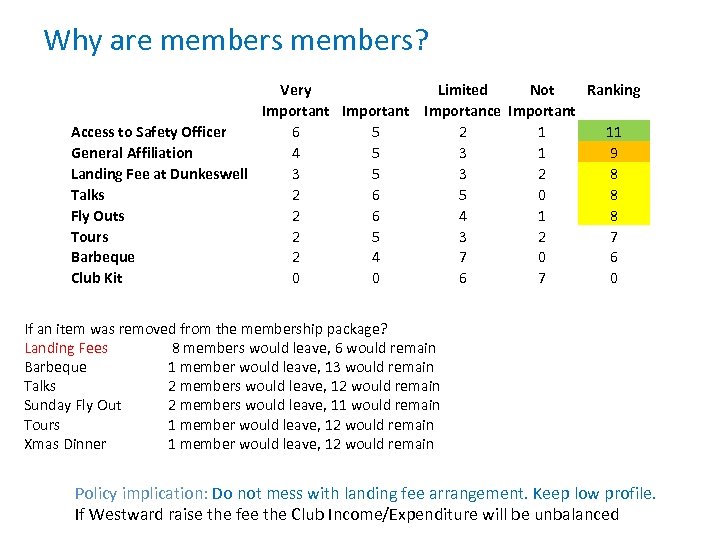 Why are members? Very Limited Not Ranking Important Importance Important Access to Safety Officer 6 5 2 1 11 General Affiliation 4 5 3 1 9 Landing Fee at Dunkeswell 3 5 3 2 8 Talks 2 6 5 0 8 Fly Outs 2 6 4 1 8 Tours 2 5 3 2 7 Barbeque 2 4 7 0 6 Club Kit 0 0 6 7 0 If an item was removed from the membership package? Landing Fees 8 members would leave, 6 would remain Barbeque 1 member would leave, 13 would remain Talks 2 members would leave, 12 would remain Sunday Fly Out 2 members would leave, 11 would remain Tours 1 member would leave, 12 would remain Xmas Dinner 1 member would leave, 12 would remain Policy implication: Do not mess with landing fee arrangement. Keep low profile. If Westward raise the fee the Club Income/Expenditure will be unbalanced