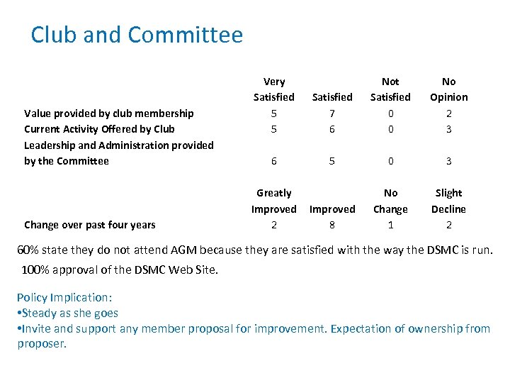 Club and Committee Value provided by club membership Current Activity Offered by Club Leadership and Administration provided by the Committee Change over past four years Very Satisfied 5 5 6 Greatly Improved 2 Satisfied 7 6 Not Satisfied 0 0 No Opinion 2 3 5 0 3 Improved 8 No Change 1 Slight Decline 2 60% state they do not attend AGM because they are satisfied with the way the DSMC is run. 100% approval of the DSMC Web Site. Policy Implication: • Steady as she goes • Invite and support any member proposal for improvement. Expectation of ownership from proposer.