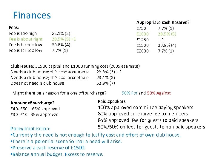 Finances Fees: Fee is too high Fee is about right Fee is far too low Appropriate cash Reserve? £ 750 7. 7% (1) £ 1000 38. 5% (5) £ 1250 +1 £ 1500 30. 8% (4) £ 2000 7. 7% (1) 23. 1% (3) 38. 5% (5) +1 30. 8% (4) 7. 7% (1) Club House: £ 1500 capital and £ 1000 running cost (2005 estimate) Needs a club house; this cost acceptable 23. 3% (3) + 1 Needs a club house; this cost acceptable 23. 1% (3) Does not need a club house 53. 9% (7) Might there be a reason for a one off surcharge? Amount of surcharge? £ 40 - £ 50 65% approved £ 30 - £ 10 35% approved 50% For and 50% Against Paid Speakers 100% approved committee paying speakers 80% approved surcharge fee to members 85% approved fee for guests to paid speakers 50%/50% on fees for guests to non paid speakers Policy Implication: • Currently the need is not enough to justify cost and effort of own club house. • There is a potential scenario that a need will arise. • Preserve a cash reserve of £ 1500. • Balance annual budget. Excess to reserve.