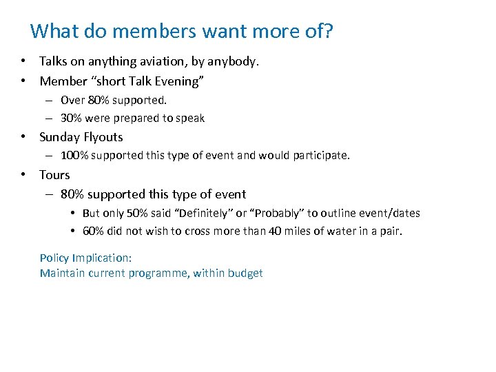 What do members want more of? • Talks on anything aviation, by anybody. • Member “short Talk Evening” – Over 80% supported. – 30% were prepared to speak • Sunday Flyouts – 100% supported this type of event and would participate. • Tours – 80% supported this type of event • But only 50% said “Definitely” or “Probably” to outline event/dates • 60% did not wish to cross more than 40 miles of water in a pair. Policy Implication: Maintain current programme, within budget